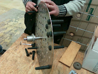Έναν ανοξείδωτο δίσκο πάχους 3 χιλιοστών με διάμετρο 2 εκατοστά μικρότερο από τη εσωτερική διάμετρο του βαρελιού. Στο δίσκο αυτό θα πρέπει να ανοιχτούν τρύπες ώστε να μπουν τα ελαστικά δάχτυλα ακτινωτά. Στο κέντρο του δίσκου κολλήθηκε σωλήνας 5 εκατοστών αντίστοιχης διατομής με τον άξονα με το ρουλεμάν ώστε να φωλιάσει και να ασφαλίσει στον άξονα.