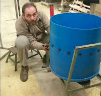 Ξεκινάμε την κατασκευή με το τρύπημα της βάσης του βαρελιού στο κέντρο για την τοποθέτηση του άξονα με το έδρανο και τα ρουλεμάν. Μετά τοποθετούμε τα ελαστικά δάκτυλα στον κεντρικό ανοξείδωτο δίσκο και το βιδώνουμε τον άξονα μετάδοσης κίνησης και το βαρέλι πάνω στη βάση στο καρότσι με τις ρόδες (την οποία μετασκευάσαμε κατάλληλα) που είχαμε έτοιμη από άλλη κατασκευή.