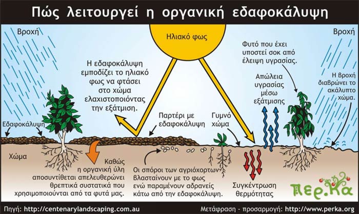 - Ρυθμίζει τη θερμοκρασία του εδάφους, κάτι πολύ σημαντικό για την ανάπτυξη πολλών φυτών. Ανάλογα με το είδος εδαφοκάλυψης, η θερμοκρασία του εδάφους κάτω από την εδαφοκάλυψη μπορεί να είναι θερμότερη ή ψυχρότερη από τη θερμοκρασία του γυμνού χώματος.