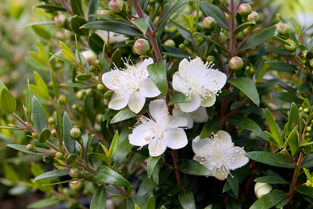Γνωστή και ως μυρσίνη ή σμυρτιά, η μυρτιά φτάνει σε ύψος δύο μέτρων με ένα θαμνώδες και σχετικά στρογγυλό σχήμα.