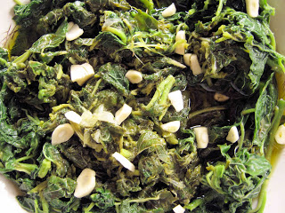 Εκτέλεση: Καθαρίζουμε και πλένουμε πολλά χέρια τα χόρτα. Τα βράζουμε σε ελαφρά αλατισμένο νερό και τα στραγγίζουμε. Καίμε μία κουταλιά λάδι και ελάχιστο βούτυρο και σωτάρουμε τα χόρτα για 10 λεπτά. Κοπανίζουμε το σκόρδο μαζί με λίγο αλάτι και το ανακατεύουμε με τη γιαούρτη. Τοποθετούμε τα χόρτα σε μεγάλη πιατέλα, ρίχνουμε από πάνω το μίγμα της γιαούρτης με το σκόρδο καίμε το υπόλοιπο βούτυρο και λάδι και περιχύνουμε με κουτάλι το περιεχόμενο της πιατέλας.6. Λάπατα με κορόμηλα.
