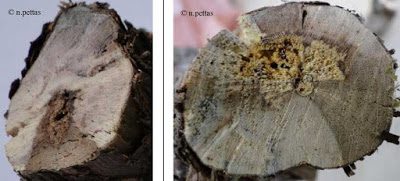 ΝΕΚΡΩΣΗ ΒΡΑΧΙΟΝΩΝ / ΕΥΤΥΠΙΩΣΗΖημιά / Συμπτώματα: Την άνοιξη, η βλάστηση των ασθενών βραχιόνων είναι καθηλωμένη και παρουσιάζει βραχυγονάτωση καθώς και παραμόρφωση, σμίκρυνση και κιτρίνισμα των φύλλων της. Παρουσιάζονται έλκη στους βραχίονες και τον κορμό, γύρω από παλιές τομές κλαδέματος. Η ασθένεια οδηγεί αρχικά σε ξήρανση κάποιων κλάδων και σταδιακά ολόκληρου του πρέμνου. Σε εγκάρσια τομή του βραχίονα εμφανίζεται τμηματική, “δίκην” κυκλικού τομέα, ξήρανση του ξύλου.Συνθήκες Μόλυνσης: Τα μολύσματα ελευθερώνονται μετά από βροχή από ξερά, προσβεβλημένα πρέμνα αμπελιού και εισέρχονται από φρέσκιες τομές κλαδέματος.ΙΣΚΑΖημιά / Συμπτώματα: Πρόκειται για χρόνια ασθένεια του ξύλου. Περισσότερο προσβάλλονται τα ηλικιωμένα πρέμνα. Προσβάλλεται το εγκάρδιο ξύλο του πρέμνου. Τα πρώτα συμπτώματα εμφανίζονται στα κατώτερα φύλλα των κληματίδων με μεσονεύριες χλωρώσεις που στη συνέχεια συνενώνονται αφήνοντας μόνο μια πράσινη λωρίδα κατά μήκος των κύριων νευρώσεων. Το καρδιόξυλο είναι εύθρυπτο, έχει σπογγώδη υφή και χρώμα ώχρας. Πολύ συχνό είναι και το σύμπτωμα της αποπληξίας.Συνθήκες Μόλυνσης: Η μόλυνση γίνεται από τις τομές κλαδέματος από μολύσματα που παράγονται πάνω σε προσβεβλημένα πρέμνα ή και σε άλλα οπωροφόρα ή δασικά δένδρα.ΒΑΚΤΗΡΙΑΚΗ ΝΕΚΡΩΣΗ (ΤΣΙΛΙΚ – ΜΑΡΑΖΙ)Ζημιά / Συμπτώματα: Προσβάλει κυρίως τα αγγεία του ξύλου. Παρατηρείται καθυστερημένη και μονόπλευρη έκπτυξη των οφθαλμών ή νέκρωση κεφαλών την άνοιξη. Στους βλαστούς, στους μίσχους των φύλλων και στη ράχη των σταφυλιών σχηματίζονται ενδογενή, επιμήκη, καστανόμαυρα έλκη. Το πιο χαρακτηριστικό σύμπτωμα είναι ο καστανός μεταχρωματισμός των αγγείων του ξύλου. Με υγρή και βροχερή άνοιξη μπορεί να εμφανιστεί γωνιώδης καστανή κηλίδωση του ελάσματος των τρυφερών φύλλων.Συνθήκες Μόλυνσης: Το βακτήριο επιβιώνει στα αγγεία του ξύλου των ασθενών πρέμνων και μεταδίδεται κυρίως με το κλάδεμα. Η μετάδοση σε αμόλυντες περιοχές γίνεται με το προσβεβλημένο πολλαπλασιαστικό υλικό. Η ασθένεια ευνοείται όταν το κλάδεμα γίνεται κατά την περίοδο Νοεμβρίου-Ιανουαρίου και από τον υγρό και βροχερό καιρό.ΦΟΜΟΨΗΖημιά / Συμπτώματα: Προσβάλει κυρίως τις κληματίδες, τις κεφαλές, τους βραχίονες και τα φύλλα των πρέμνων. Μέσα σε 15 ημέρες από την έκπτυξη των βλαστών στα κατώτερα μεσογονάτια διαστήματα παρατηρούνται μαύρες κηλίδες που αργότερα νεκρώνονται. Κατά την διάρκεια της γρήγορης ανάπτυξης παρουσιάζονται σχισίματα και αποκτούν φελλώδη όψη. Το φθινόπωρο οι προσβεβλημένες κληματίδες αποκτούν λευκό χρώμα και η επιφάνειά τους γεμίζει από σφαιροειδή σωμάτια. Στα φύλλα παρατηρούνται μικρές γωνιώδεις νεκρωτικές κηλίδες και νεκρώσεις στους μίσχους. Παρατηρείται επίσης κακή έκπτυξη των οφθαλμών και νέκρωση των κεφαλών.Συνθήκες Μόλυνσης: Τα μαύρα καρποφόρα όργανα του παθογόνου διαχειμάζουν στο προσβεβλημένο ξύλο (κληματίδες, βραχίονες, κορμούς). Με τις βροχές μεταφέρονται στους κοντινούς ευαίσθητους ιστούς. Η ασθένεια ευνοείται με παρατεταμένο υγρό και βροχερό καιρό. ΑΝΤΙΜΕΤΩΠΙΣΗΣ ΑΣΘΕΝΕΙΩΝ ΞΥΛΟΥΤα παθογόνα ξύλου προσβάλλουν κατά κύριο λόγο μέσω των πληγών του χειμερινού κλαδέματος με την παρουσία βροχής. Η ευαισθησία στην ασθένεια εξαρτάται εν μέρει από τη στιγμή που γίνονται οι τομές κλαδέματος. Οι τραυματισμοί που γίνονται νωρίς στην ληθαργική περίοδο (Δεκέμβριος) είναι πιο επιρ