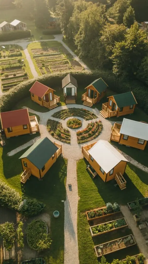 .Λεπτομέρειες: Σχεδιάστε μονοπάτια για εύκολη πρόσβαση, κοινές αποθήκες. Για παιδιά, κοινή παιδική χαρά με εκπαιδευτικά ζώα. Οικονομικά, μειώνει έξοδα κατά 40%.